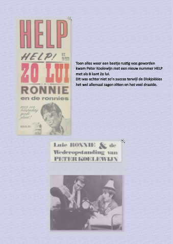 Toen alles weer een beetje rustig was geworden kwam Peter Koelewijn met een nieuw nummer HELP met als B kant Zo lui. Dit was echter niet zo’n succes terwijl de Diskjokkies het wel allemaal zagen zitten en het veel draaide.