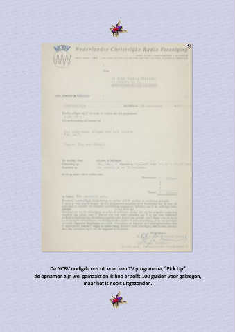 De NCRV nodigde ons uit voor een TV programma, “Pick Up” de opnamen zijn wel gemaakt en ik heb er zelfs 100 gulden voor gekregen, maar het is nooit uitgezonden.